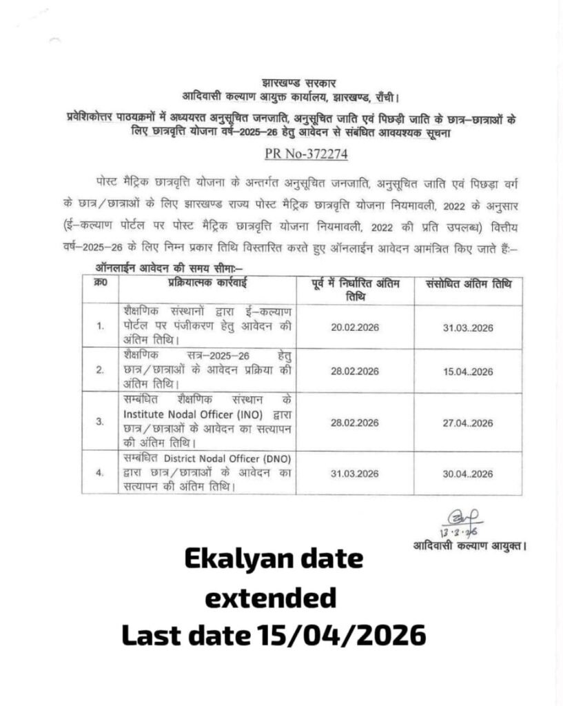 Jharkhand सरकार की ओर से शैक्षणिक वर्ष की आवेदन की अंतिम तिथि जो पहले 28/02/2025 थी उसे बढ़ाकर 15/04//2026 कर दिया है। जिससे कोई भी छात्र/छात्राएं जिन्होंने अपना आवेदन नहीं किया है वो अब 15/04/2026 तक कर सकते हैं।