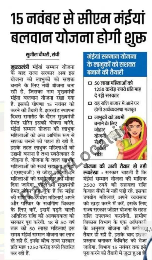 मुख्यमंत्री मंईया सम्मान योजना के बाद झारखंड सरकार अब इस योजना की लाभुक महिलाओं को आर्थिक रूप से सशक्त बनाने की दिशा में एक और बड़ी पहल करने जा रही है। सरकार की नई योजना का नाम मुख्यमंत्री मंईया बलवान योजना (Mukhyamantri Maiya Balwan Yojana) रखा गया है। इसकी घोषणा 15 नवंबर 2025, यानी झारखंड स्थापना दिवस के अवसर पर मुख्यमंत्री हेमंत सोरेन द्वारा की जाएगी।
